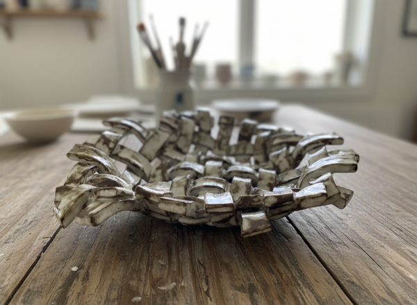 This is a hand-built ceramic basket crafted from wide, flat strips of clay in a loose, open-weave pattern. Its form is a shallow, organic platter with a rustic and sculptural quality. The piece is finished with a high-contrast glaze, featuring a dark, mottled brown or black pattern over a light, creamy base, which highlights its textured, handmade appeal.